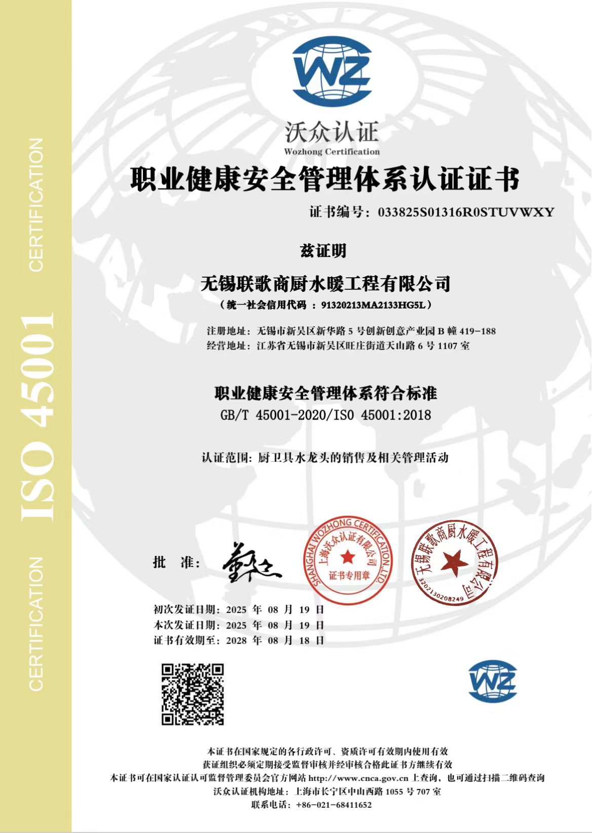 职业健康安全管理体系认证证书