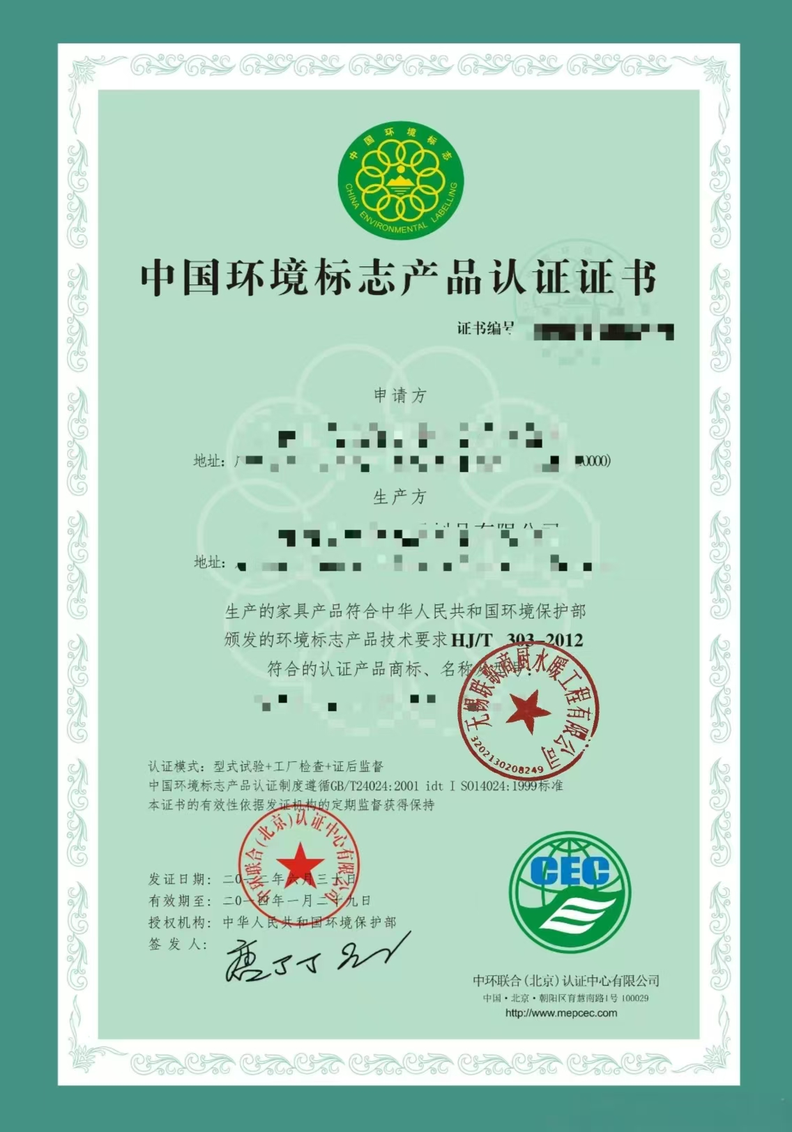 中国环境标志产品认证证书